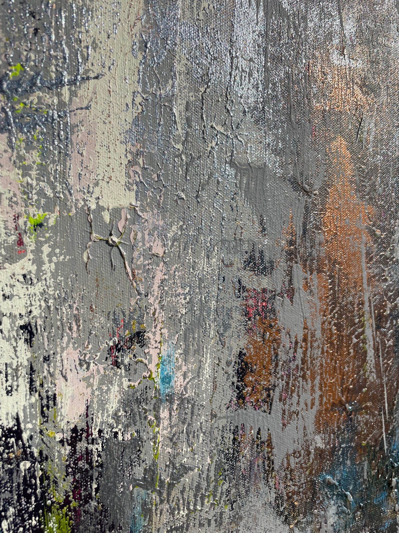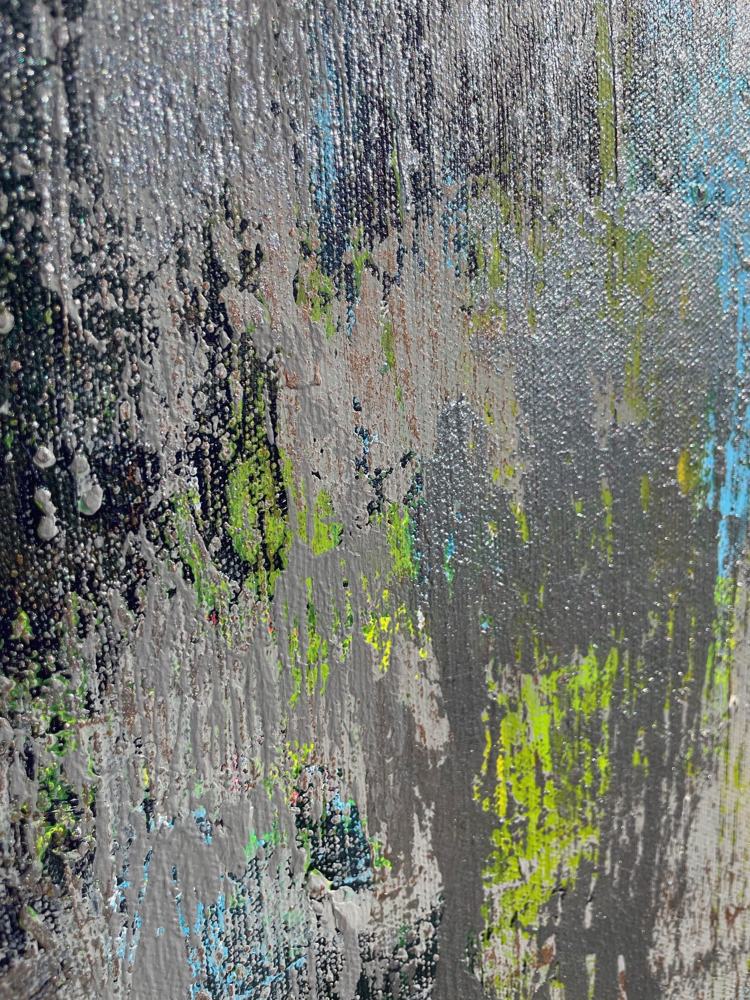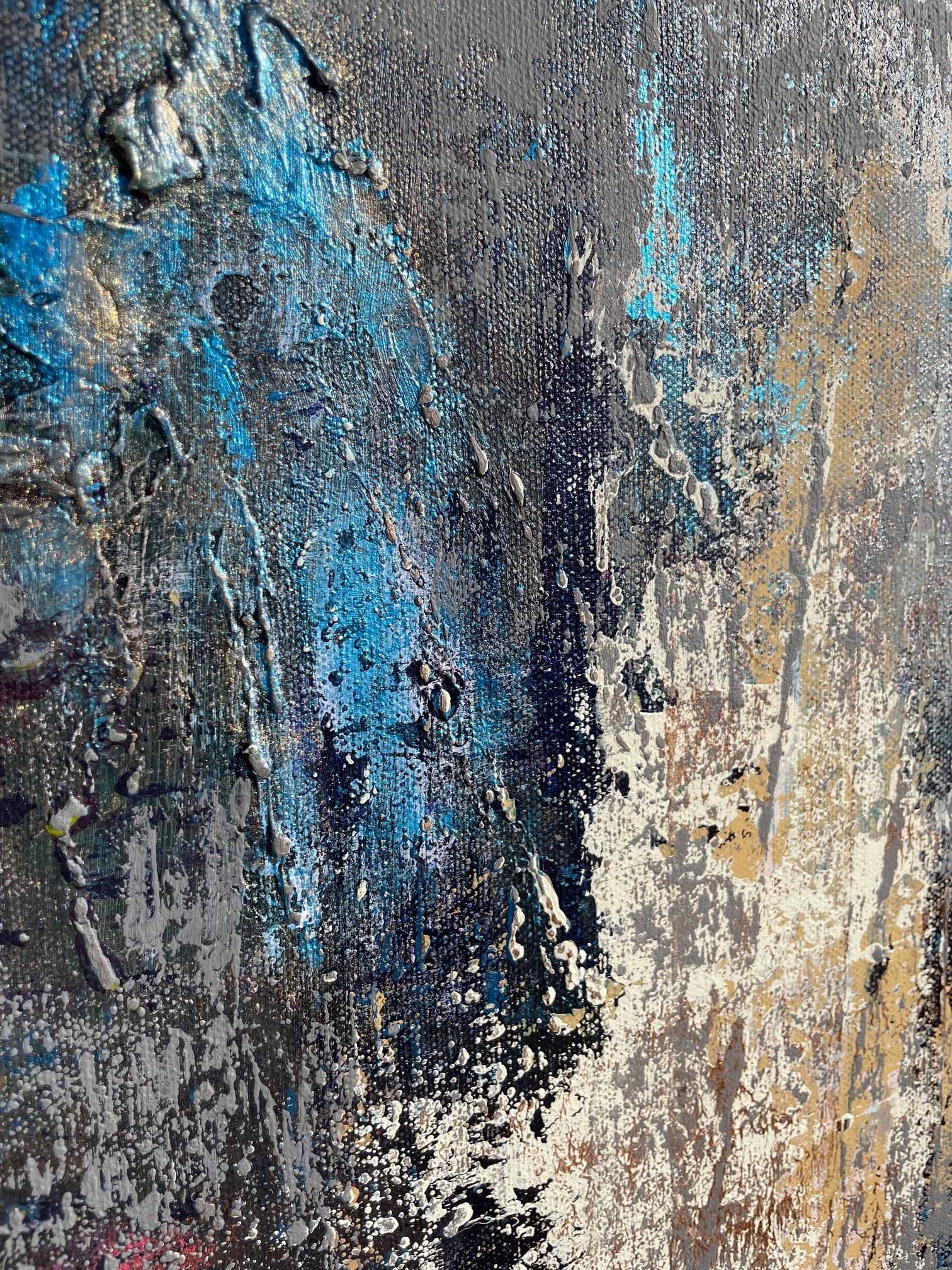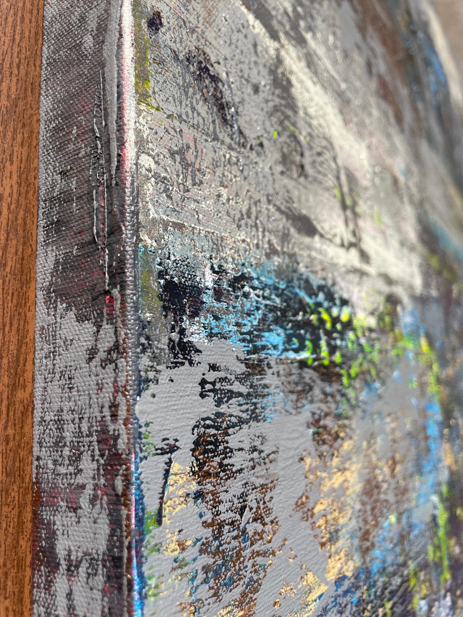 Az akril festékrétegek alatt művészi struktúra teszi még láványosabbá, tapinthatóvá az alkotást. Az élek 3,5 cm vastagságúak, a festmény tónusai és mintázata az éleken tovább folytatódik.